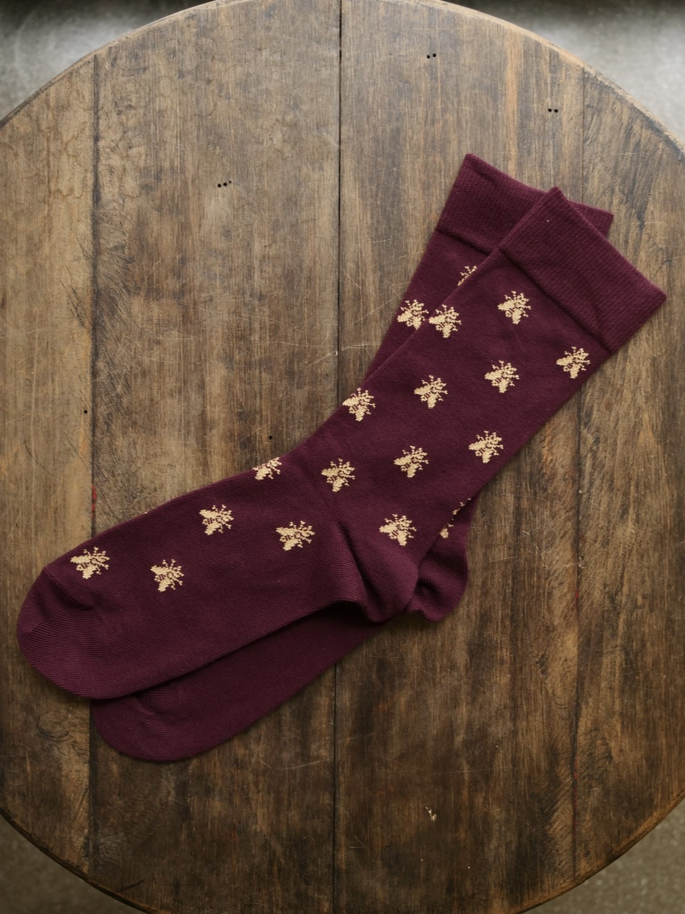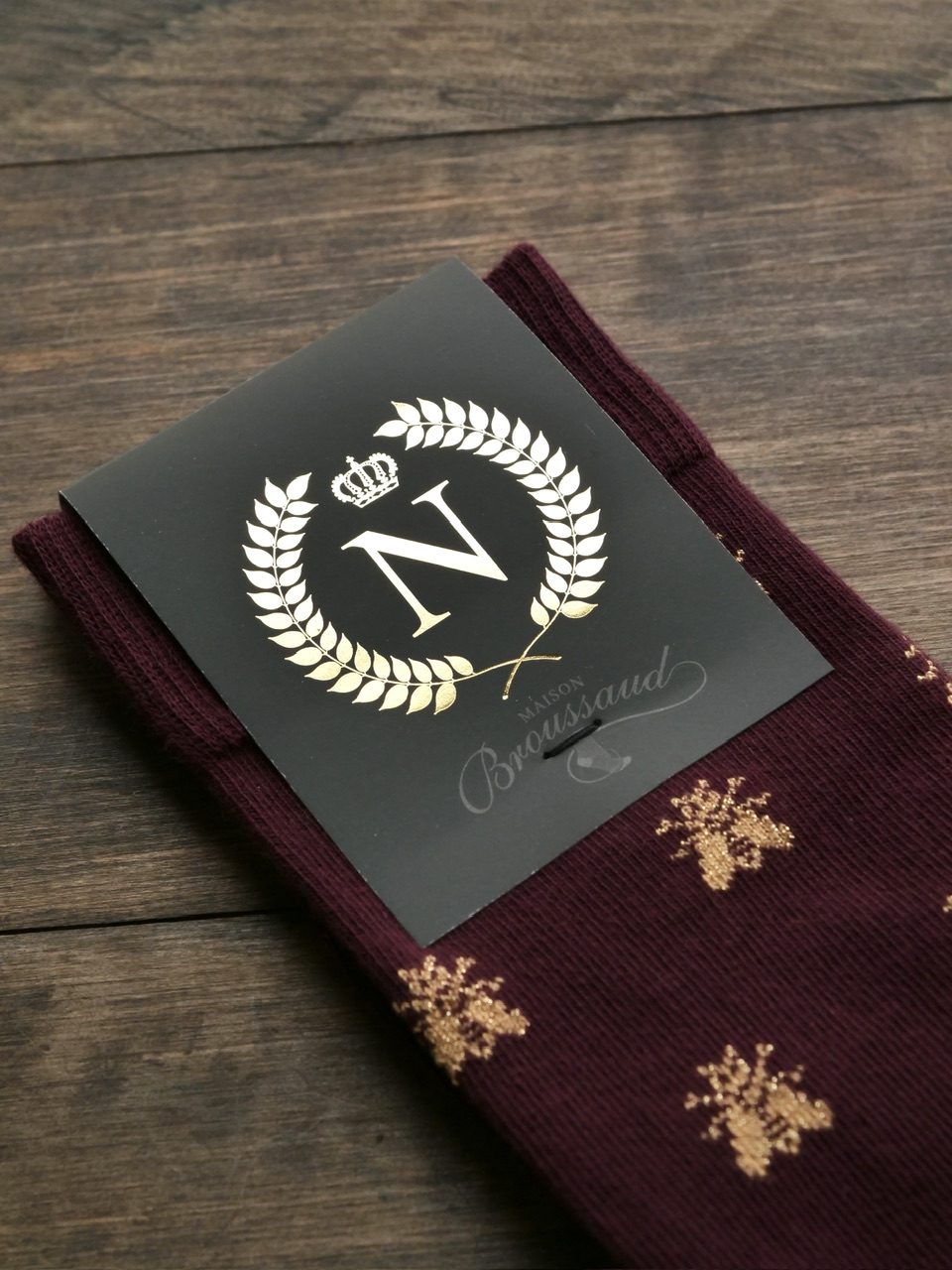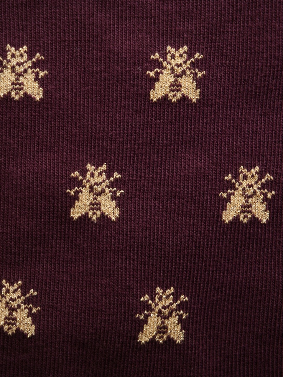 ボルドーの地に金糸で刺繍された蜂が全体に散りばめられた、なんともフランスらしい一足。