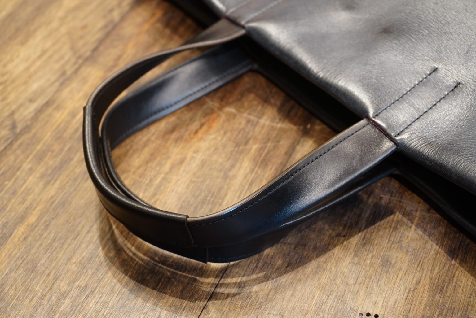 続いて、持ち手部分に革当てを縫い付けてハンドルが完成。