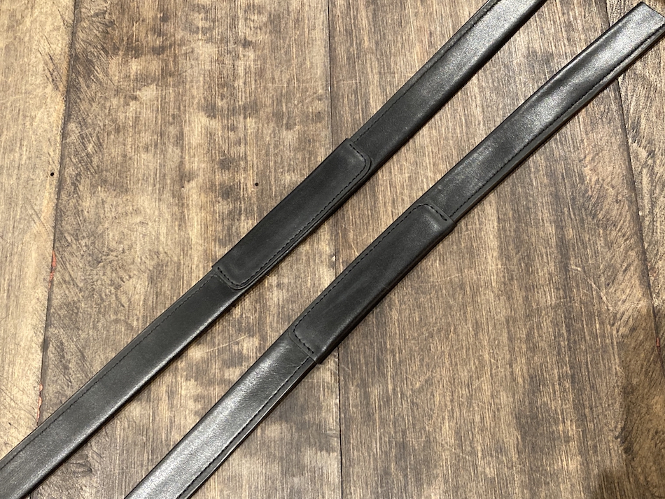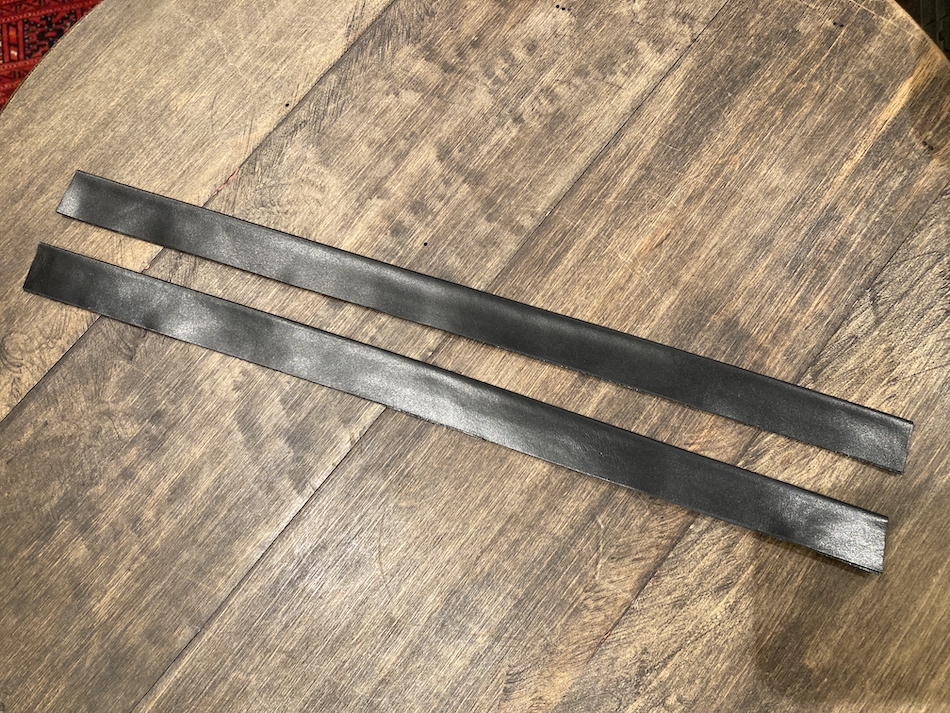 短冊状に切った革を縦方向に折り、間に補強材を挟みます。