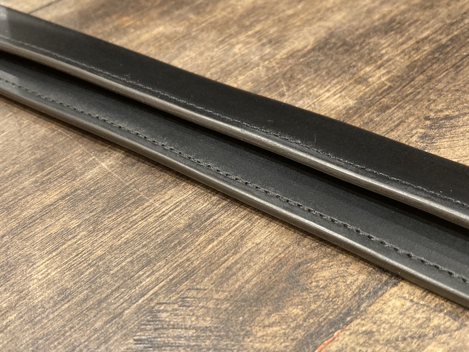 折り返した反対側にステッチをかけ、その後エッジの仕上げ(コバ磨き)を行います。