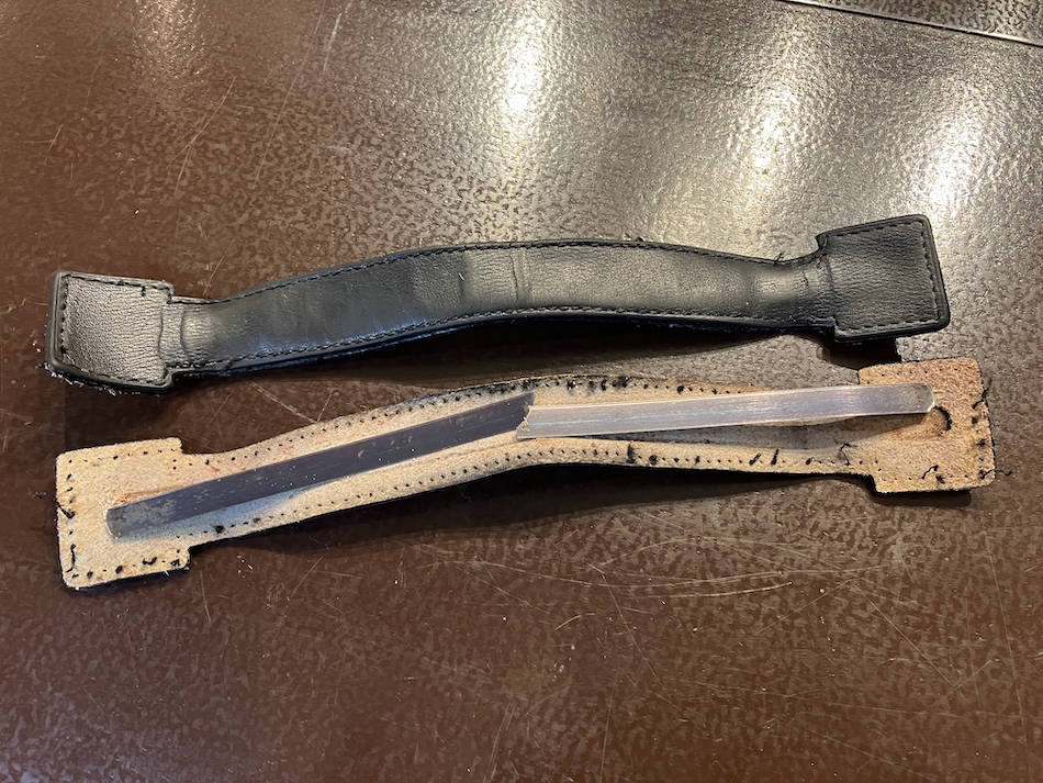 ハンドルはだいぶ手が込んでいて、4枚重ねた革の中央に弾性のある金属の板が仕込まれていました。