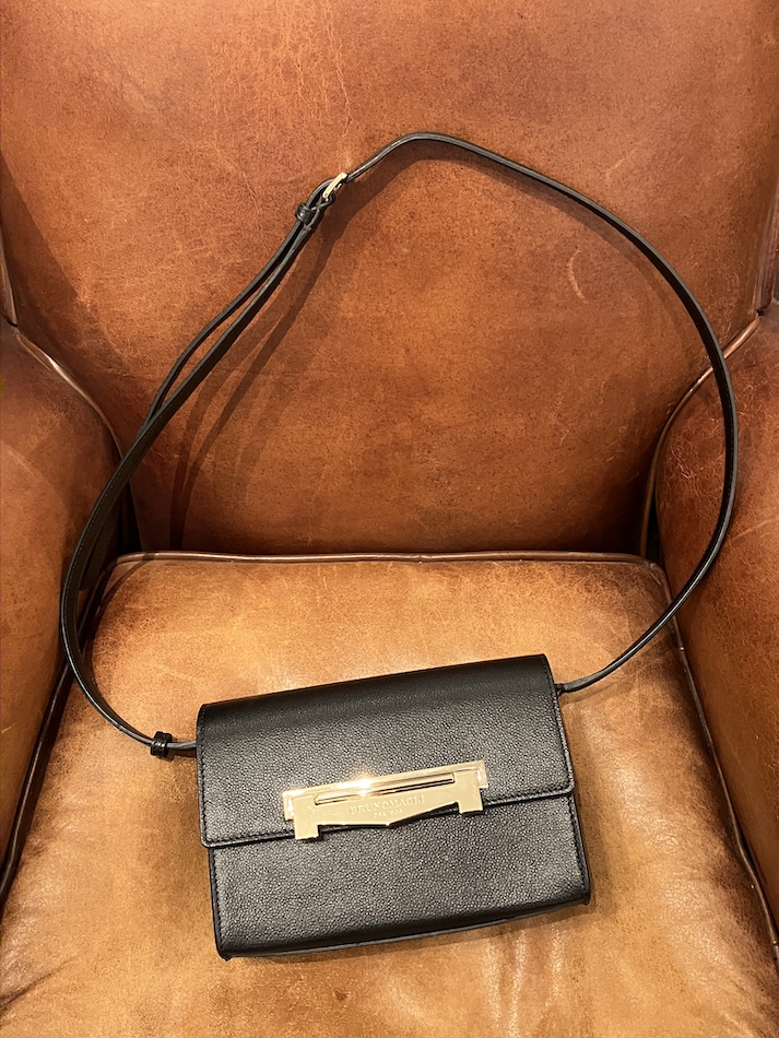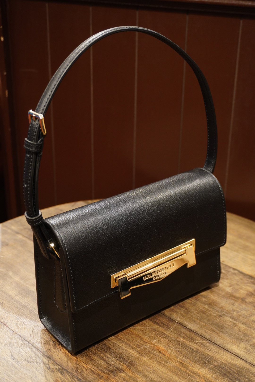 高級感のあるグレインレザーに、フラップの留め具がアクセントとなった素敵なバッグ。