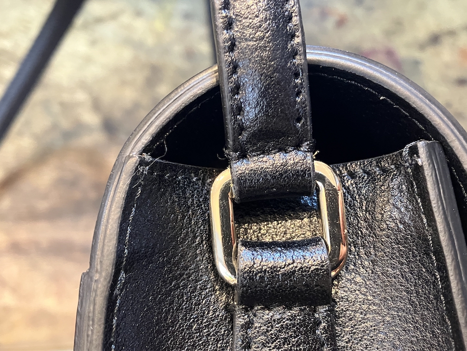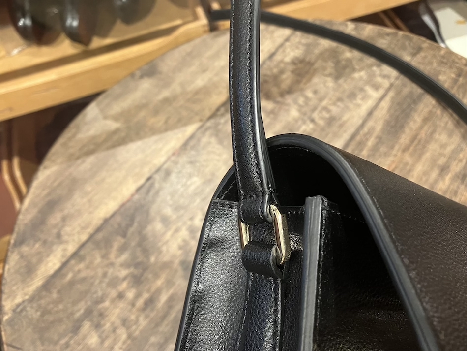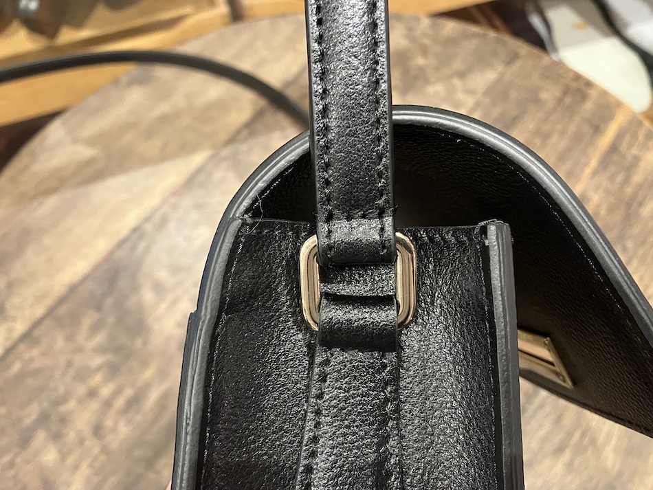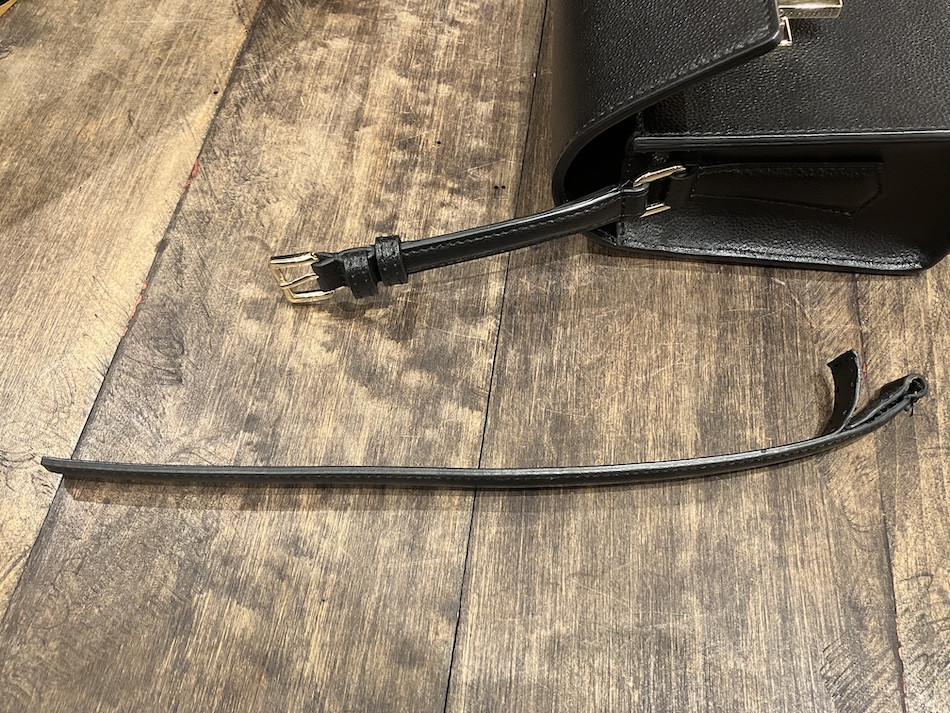 今後は短めにして肩がけで使いたいとのことで、ストラップを詰める作業を行いました。