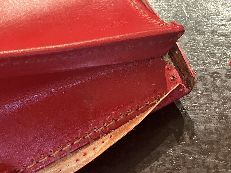 先ずは下部の織り込まれている箇所のステッチを外していきます。