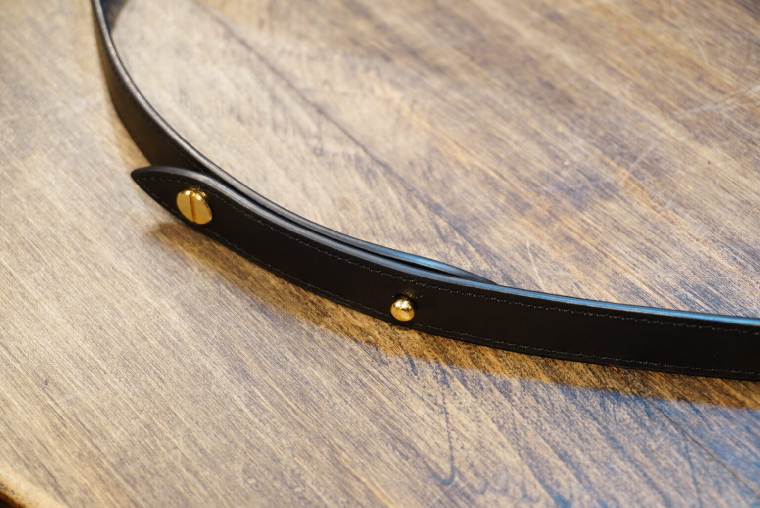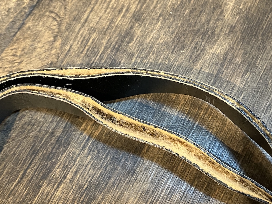 ストラップは、革を2枚貼り合わせ、その間に補強材を挟んだ3層構造になっています。
