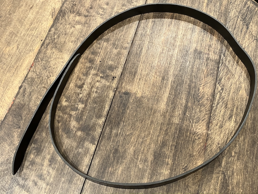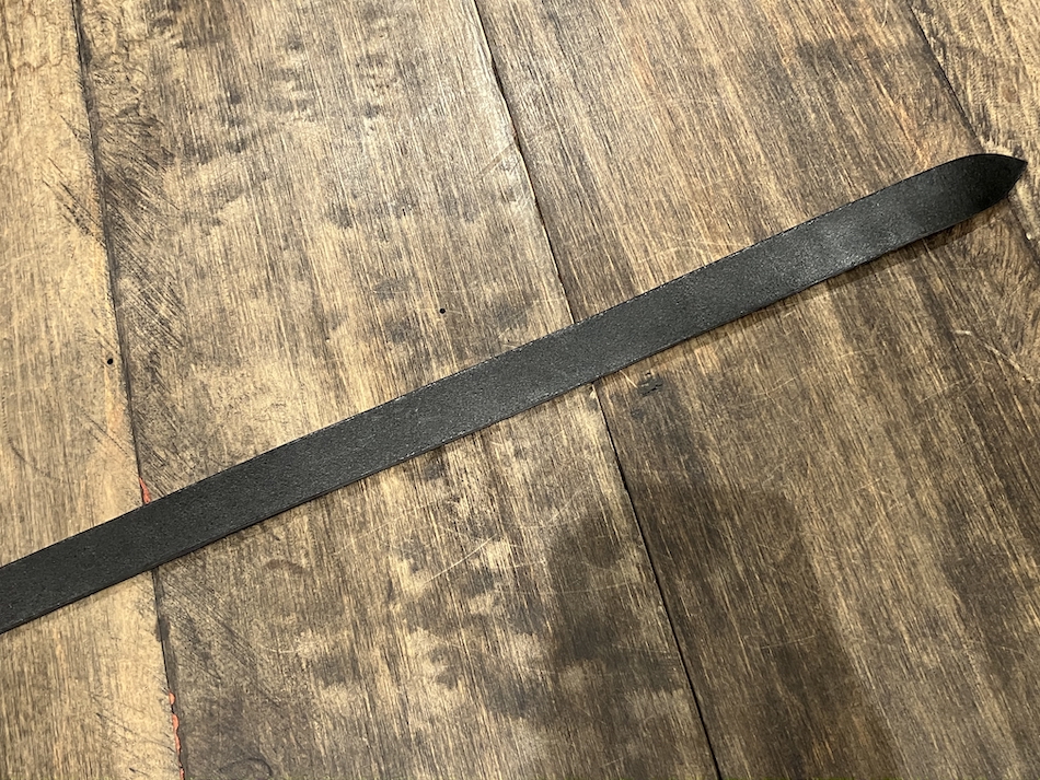 まず、短冊状に裁断した2枚の革を貼り合わせ、間に補強材を挟み込みます。
