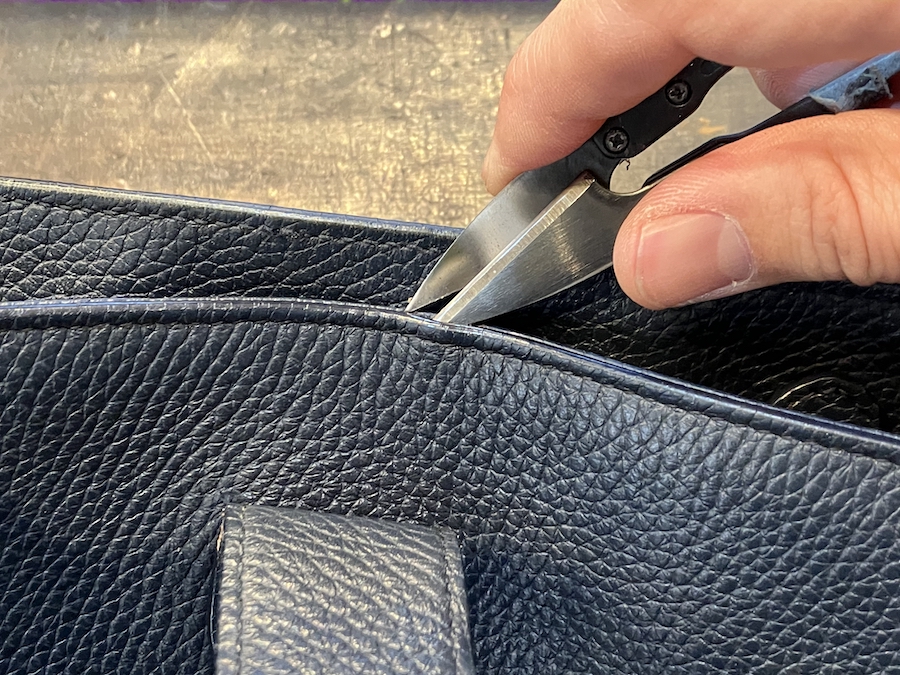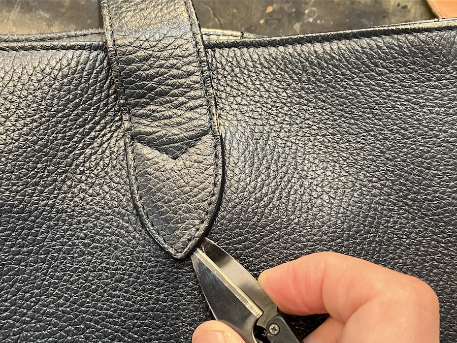 続いて、ハンドルをボディに縫い留めているステッチも解いていきます。