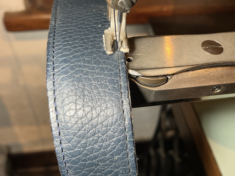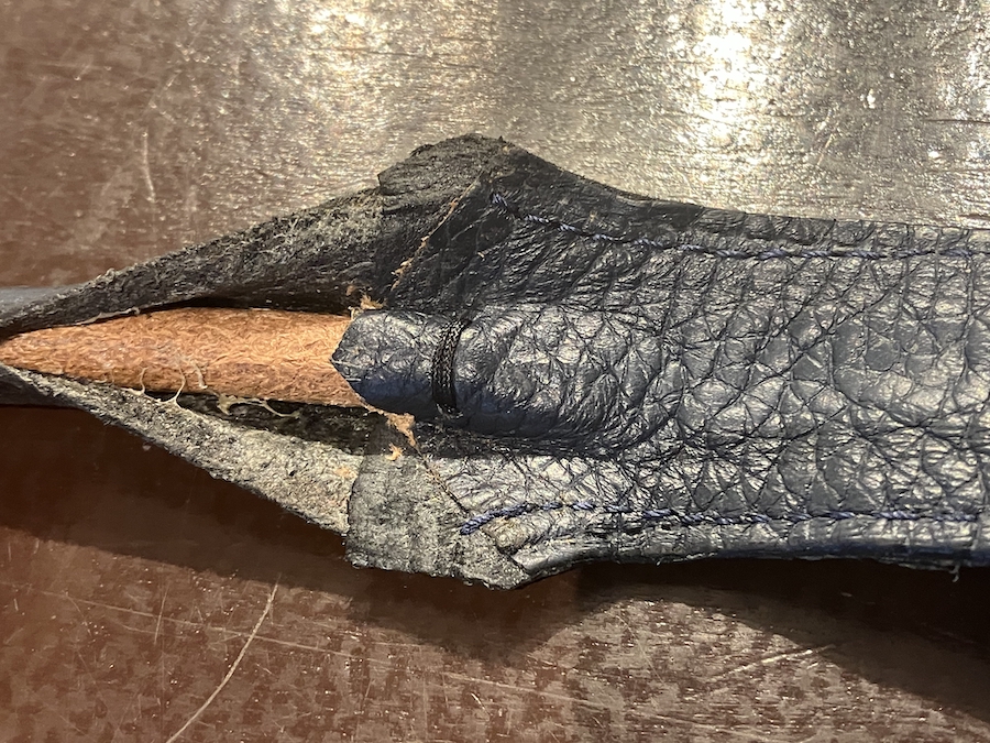 新しい芯材と芯棒を入れ、剥がした革を再度貼り合わせて縫い戻します。