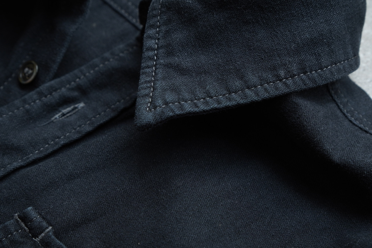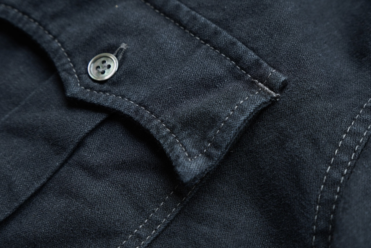 襟やポケット、袖口など、ステッチの走る箇所にはパッカリングが見られ、フラットだった生地が立体的に。