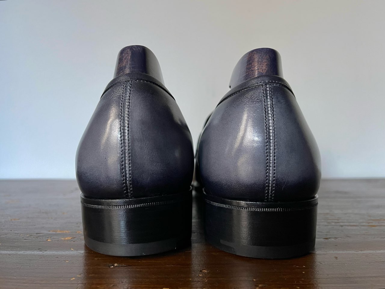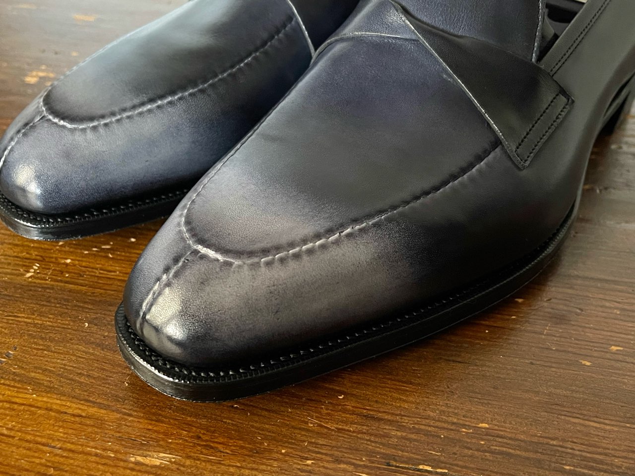 アッパーの革は“Deco black”と呼ばれるグレー系のパティーヌ仕上げ。