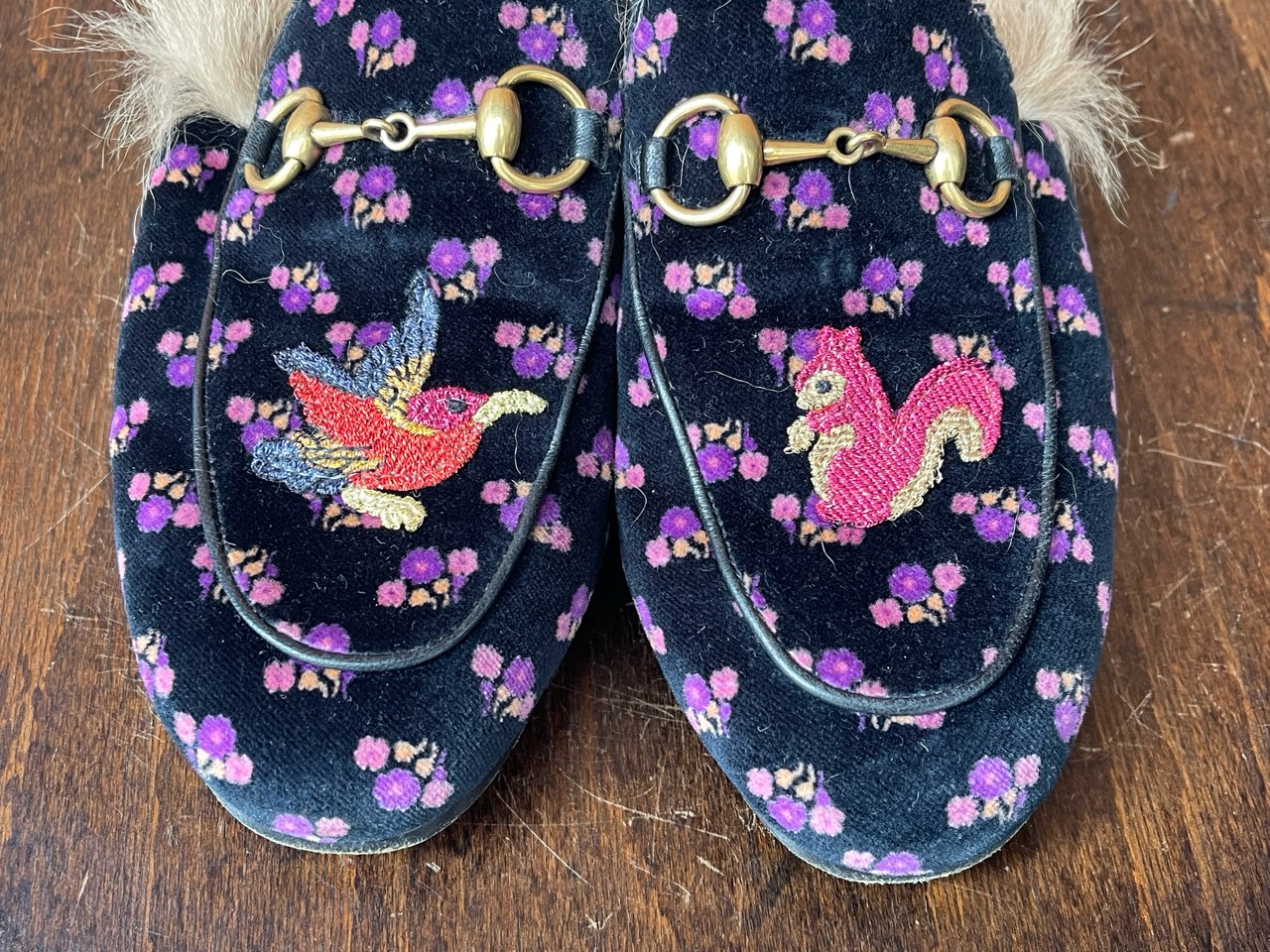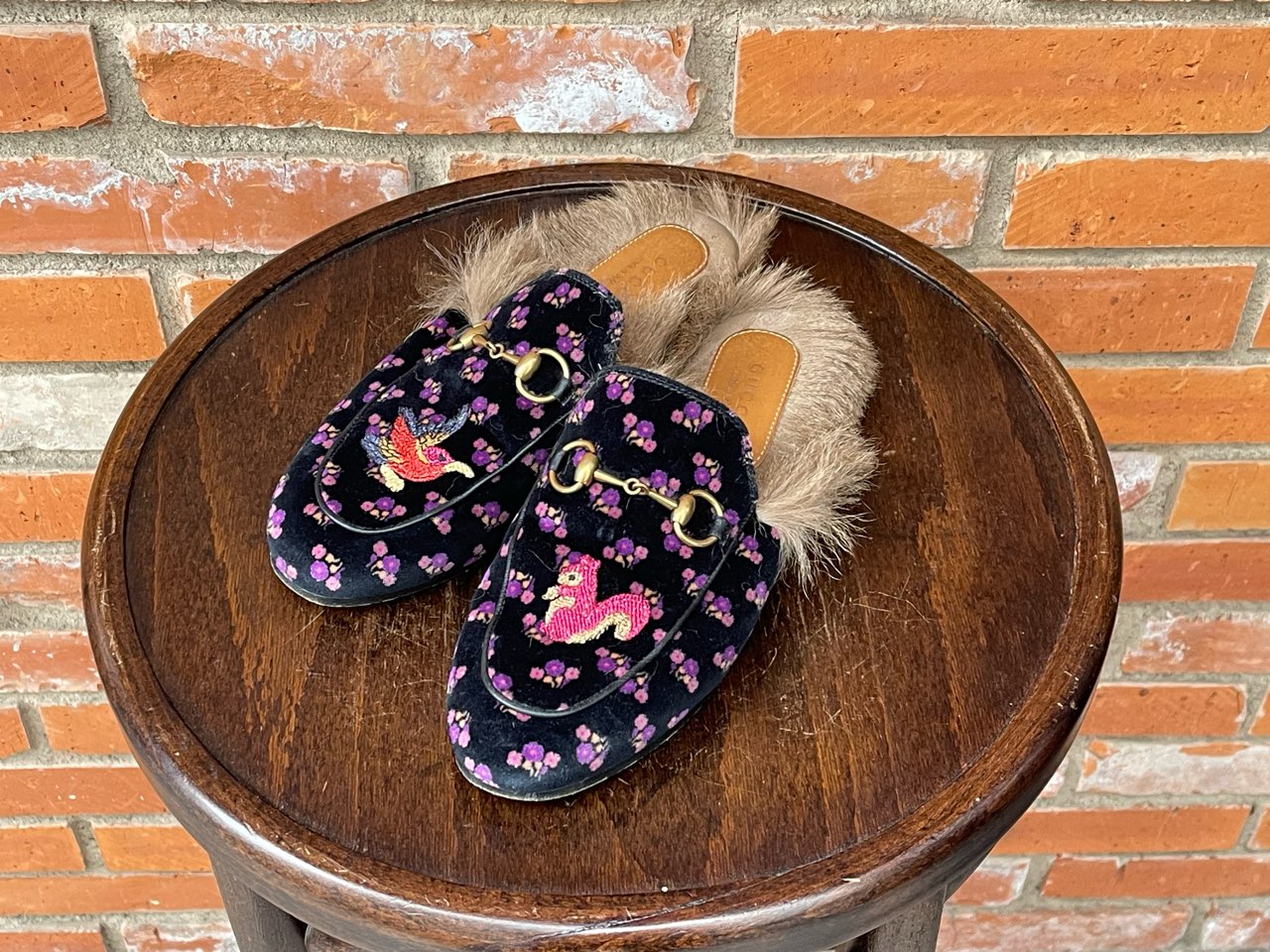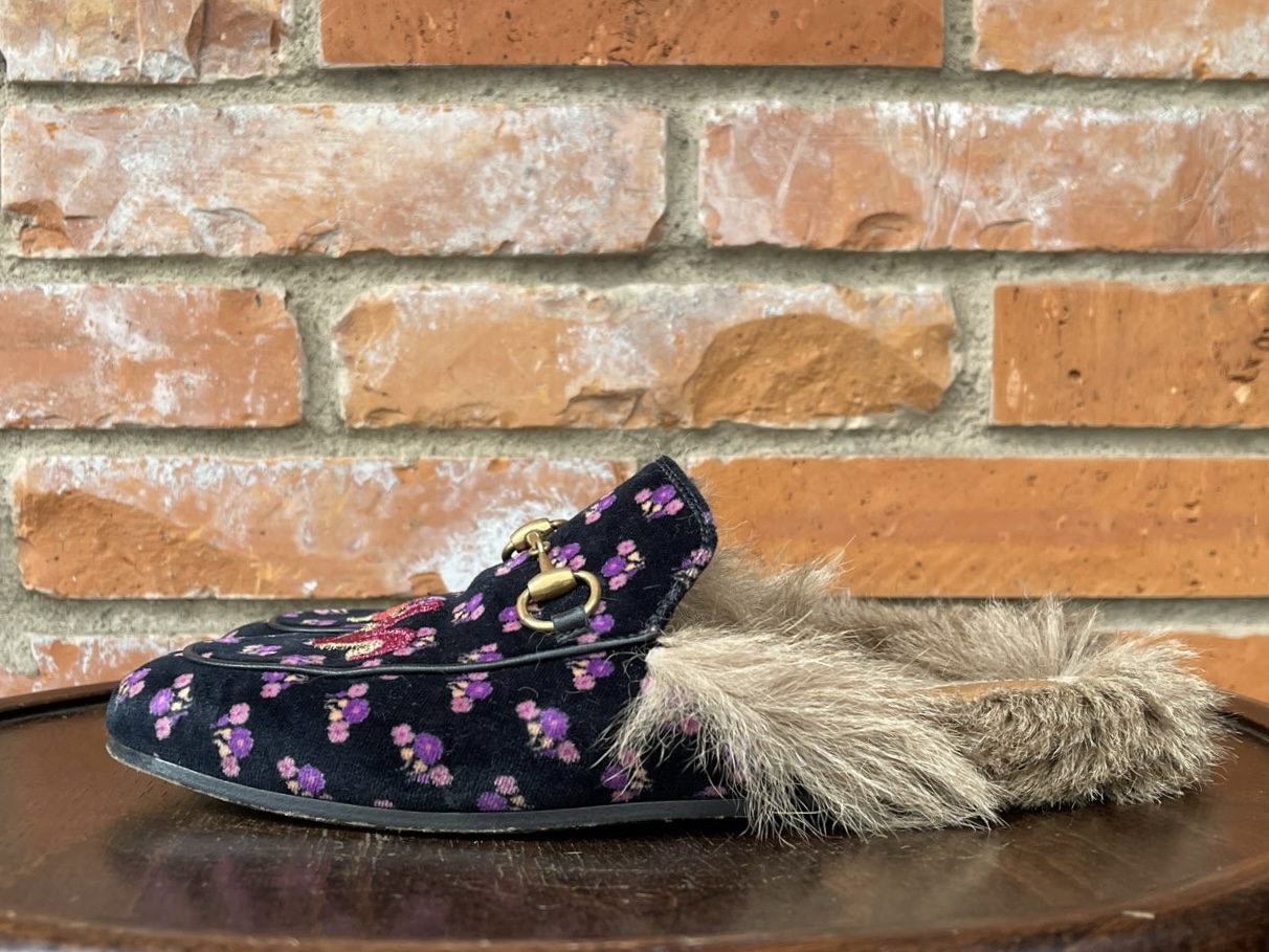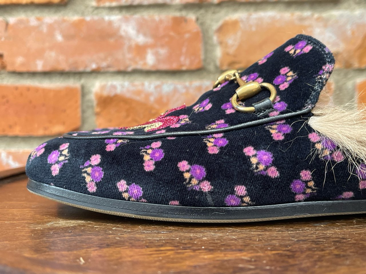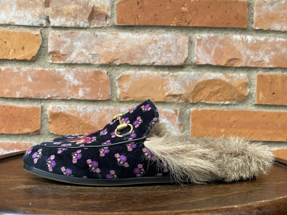 グッチ定番のホースビットをあしらい、花柄ベルベットに左右異なったデザイン性の高い一足ですね。