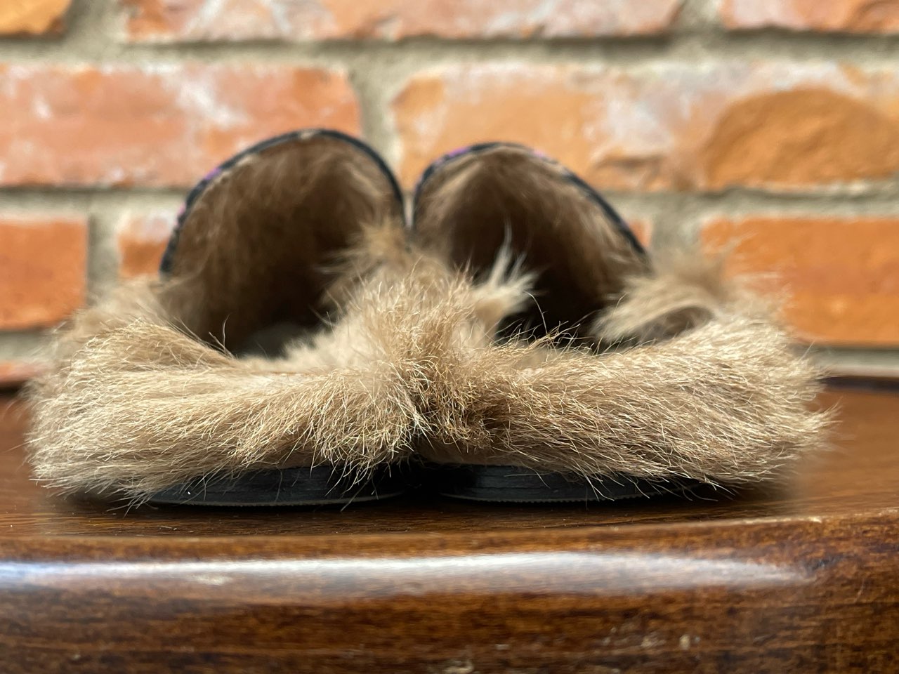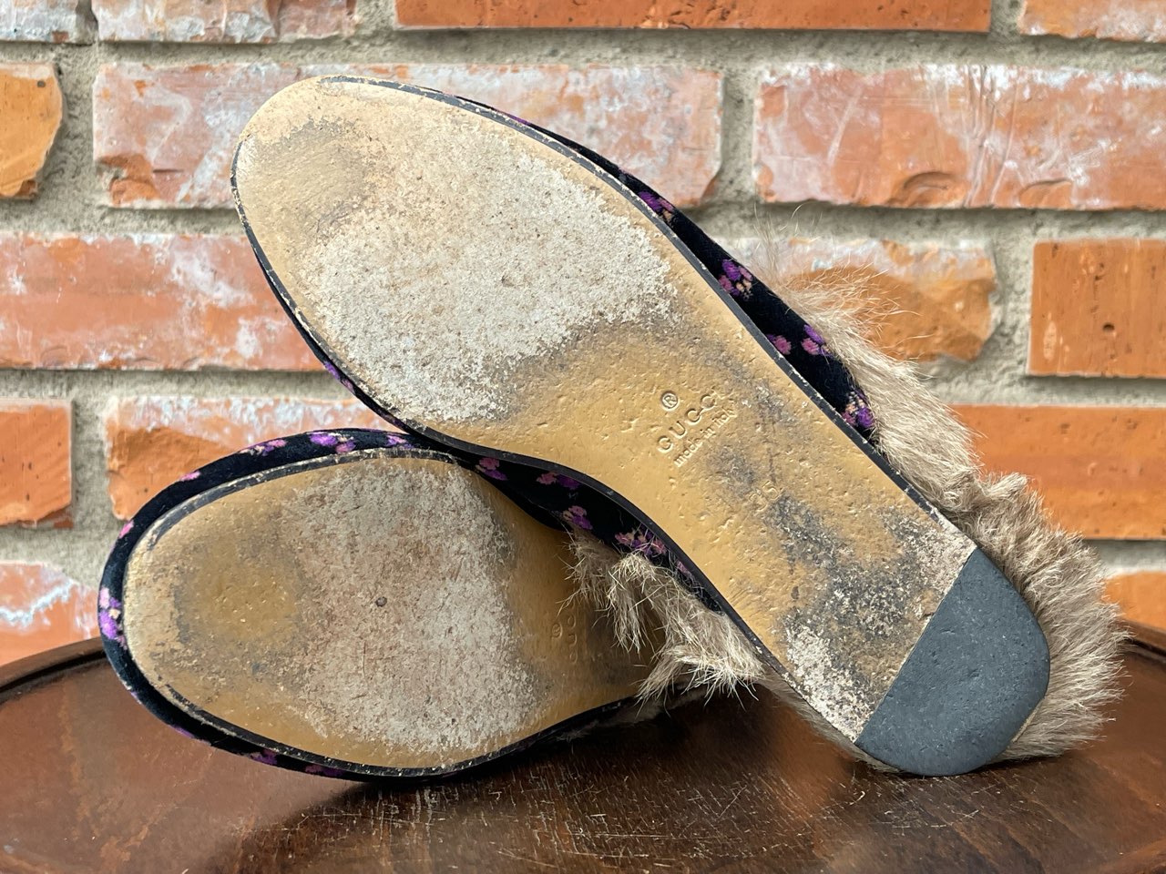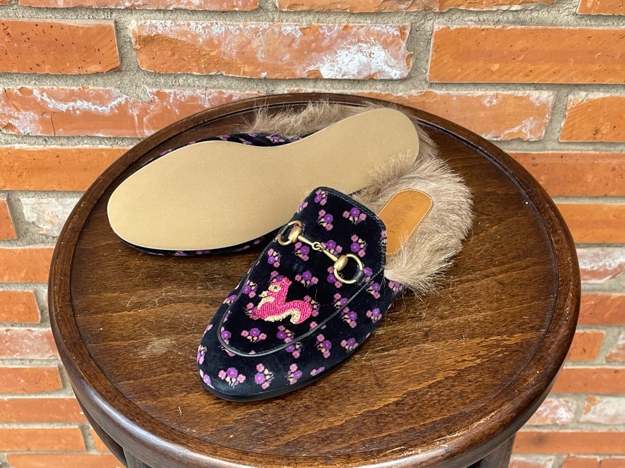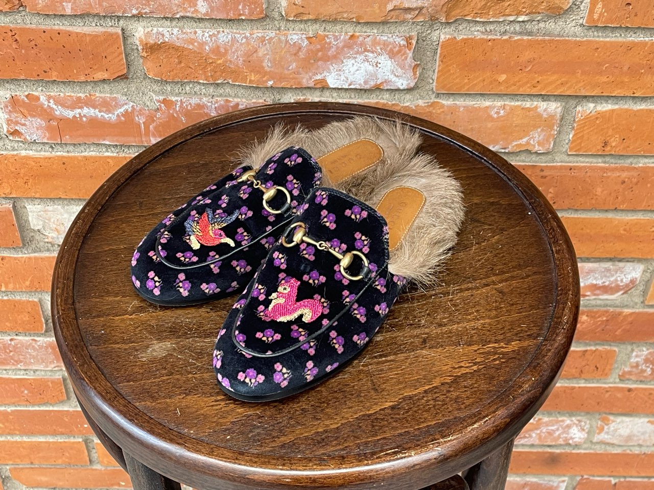 グッチ定番のホースビットをあしらい、花柄ベルベットに左右異なったデザイン性の高い一足ですね。