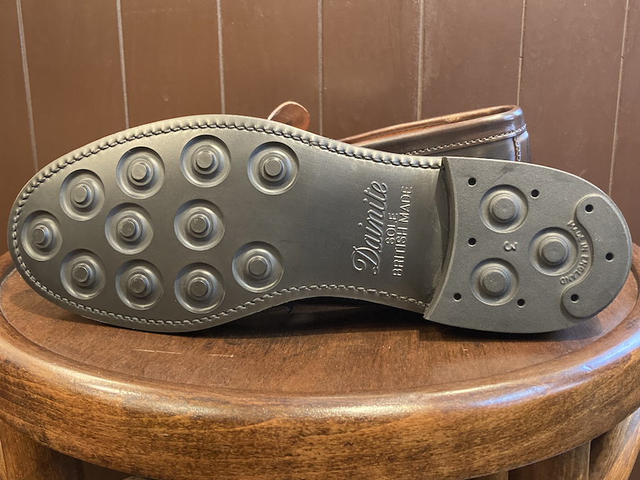 ソールを適正な位置で貼り、縫い込み、削り、コバが真っ直ぐになりました。