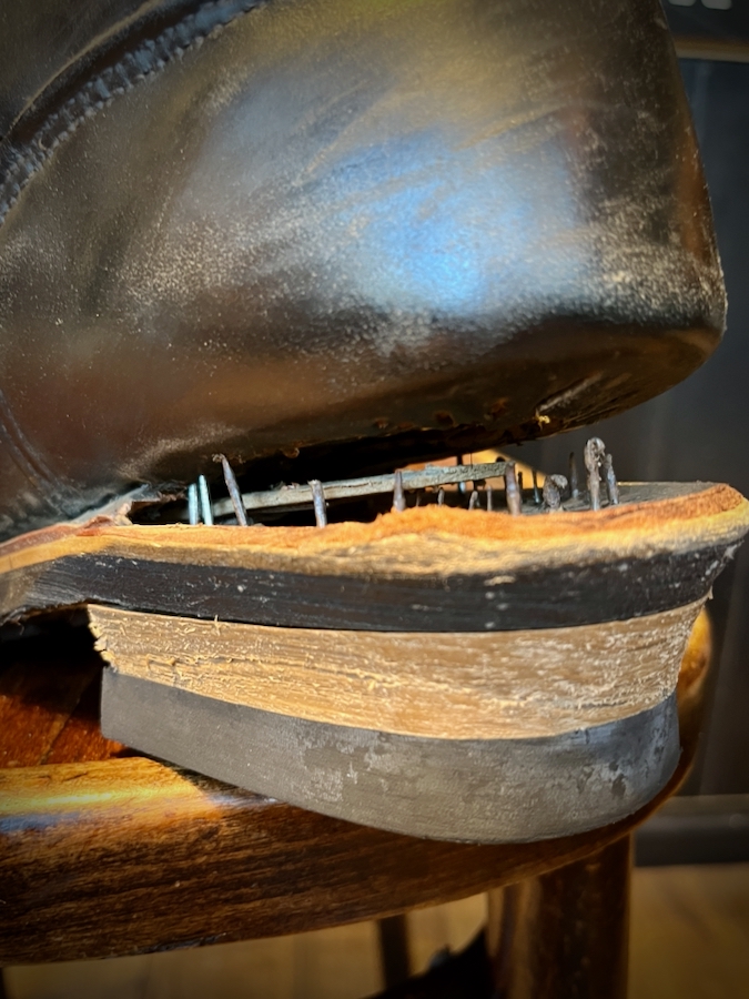 バキバキに割れてしまった中底にソールとヒールを固定するため釘を再度打たなければ修理できないので