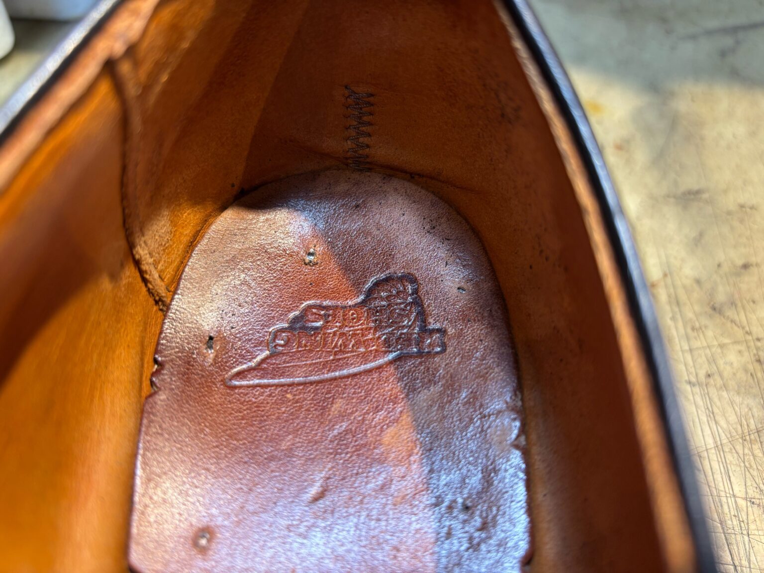 今回のようにユニットタイプのソールから仕様変更する場合はヒールを釘でかしめて固定するため、ソールに釘のあたりが出ることがあります。