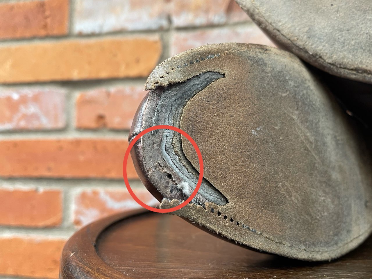 さらにウェルトも削れてスクイ縫いが切れている状態。