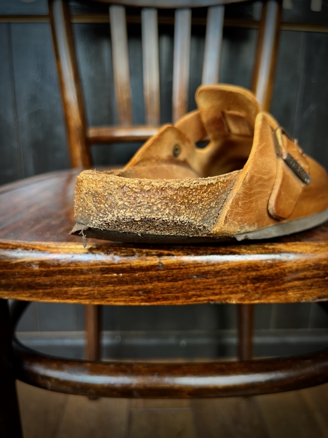 カカトのすり減りがソールを超え、土台のコルクも削れていました。